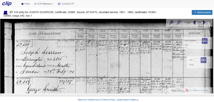 The National Maritime Museum's Caird Library holds copies of mariners certificates and applications for Masters and Mates and Engineers. The certificates of Masters and Mates can now be viewed on Ancestry, and include the applications which actually contain the most interesting information. If one searches for Joseph Scarrow on Ancestry, in the immigration and travel section, the result below is shown: