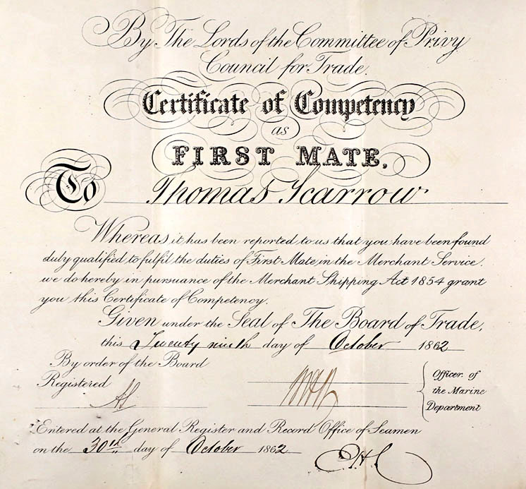 Thomas Scarrow, Master Mariner: Certificates and Claims